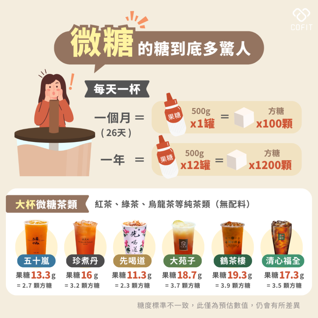 以下是根據去年手搖飲品牌排行榜前六名的店家,Cofit 營養師團隊為大家整理了「微糖茶甜度預估表」,快來看看究竟所謂的微糖,實際到底是加了多少糖?還有酸性飲料的微糖,糖分可能比你想的還要高喔!
