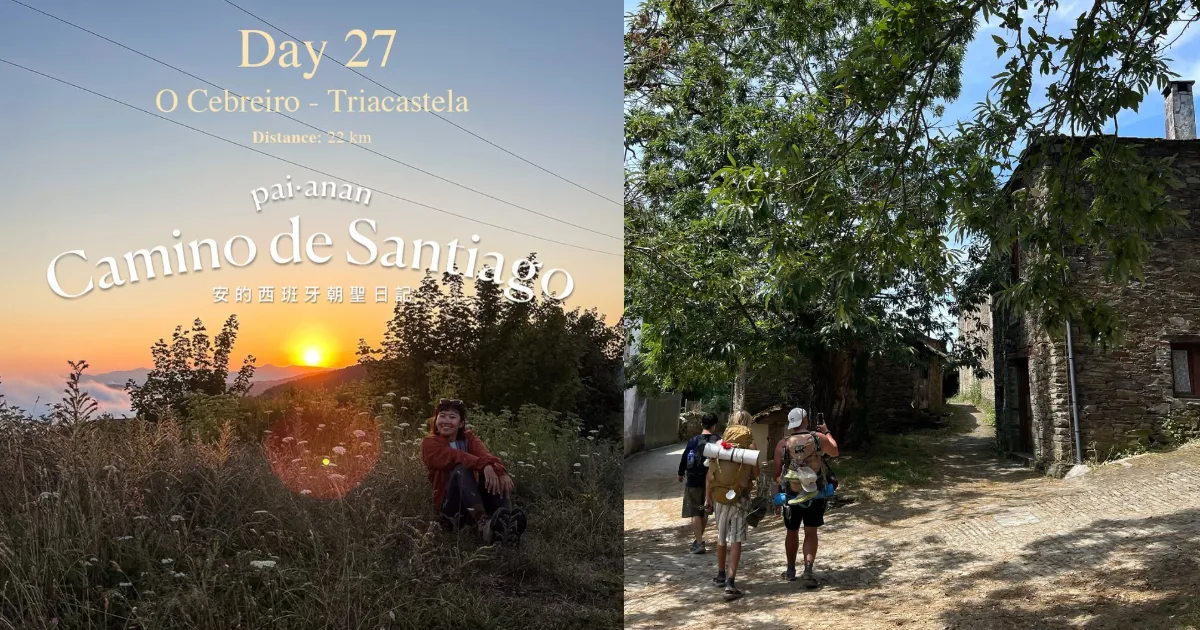 百安安在朝聖之路的第 27 天,迎來了又一段充滿驚喜與美麗的旅程。這一天,他和夥伴們來到 O Cebreiro,踏上了通往 Triacastela 的路途。在黑夜的包圍中,眼前的雲海猶如魔幻畫面,天際的繁星點亮了這段徒步旅程的開端,走到山頂後,他們決定等待日出時的黃金時刻,而這麼絕美日出,成了她此生看過最美前三名。
